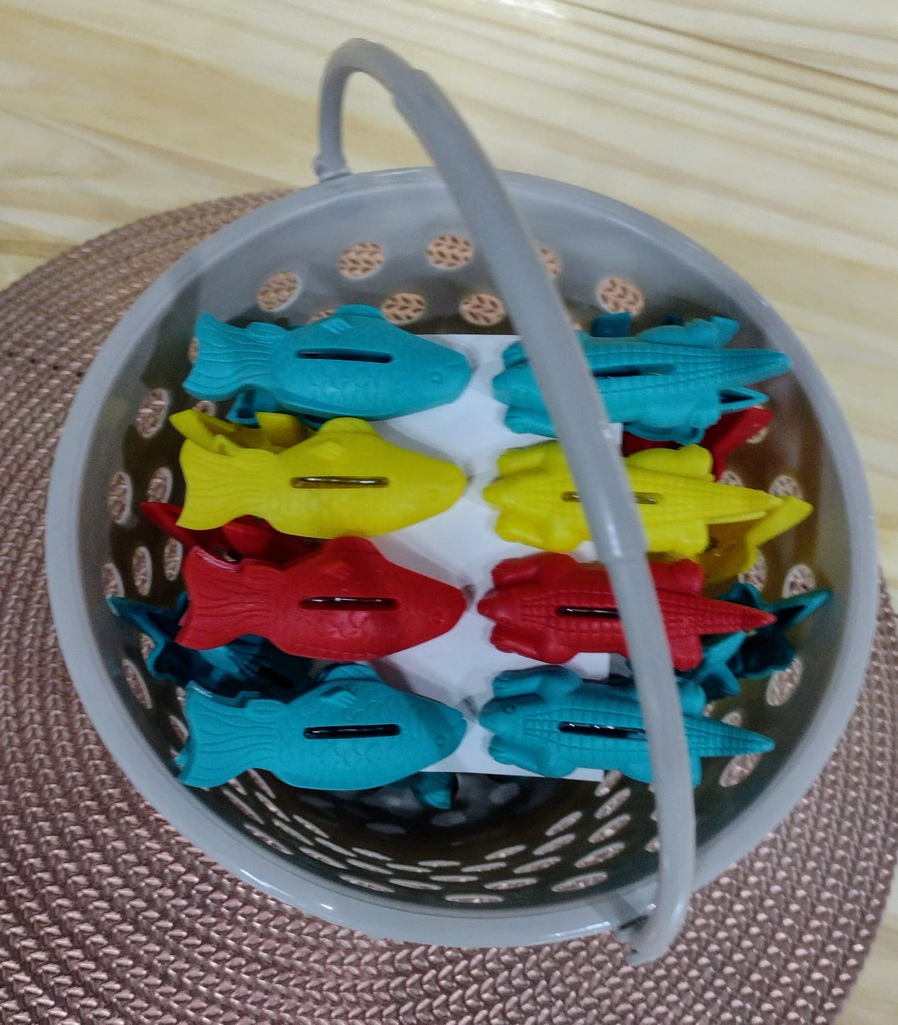 Acompanha 01 cesto para prendedores, feito de plástico super resistente, sem tampa de encaixe, para facilitar o manuseio o produto vem com alças, cesto com detalhes que imitam a juta.